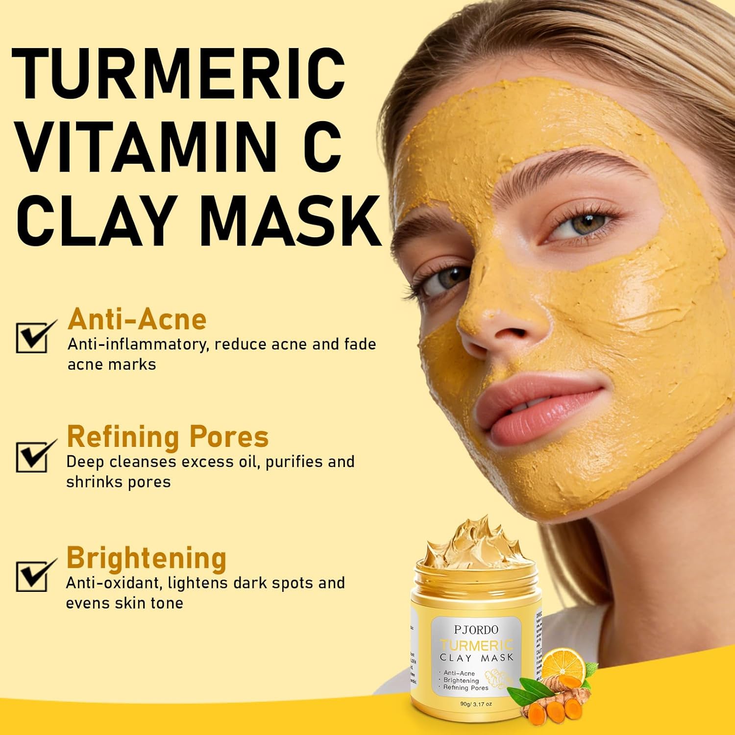Turmeric Vitamin C Clay Mask: This Turmeric clay mask for face is rich in vitamin C, which helps improve facial complexion and rejuvenate skin with a natural glow, effectively lightens dark spots, improves dullness, evens out skin tone and enhances skin radiance. A natural antioxidant that helps collagen production, slows skin aging, increases skin elasticity and makes skin more delicate and firm. Effectively reduces acne, whiteheads and blackheads.