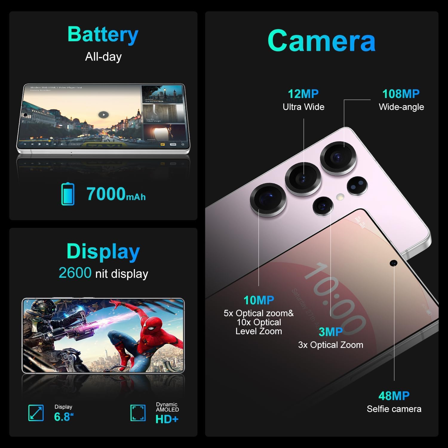 [snapdragon8gen3+ 512GB large storage] Snapdragon8Gen3 has outstanding performance and innovation in AI and 5Gnet.8GB RAM, the super core frequency increased to 3.4GHz, 10-core processor enjoys smooth games and seamless scrolling on the 6.8-inch large display.512GB ROM, can also support up to 128GB of storage space through TF memory card expansion, to meet your daily needs such as playing games, playing social network applications, storing movies, etc.