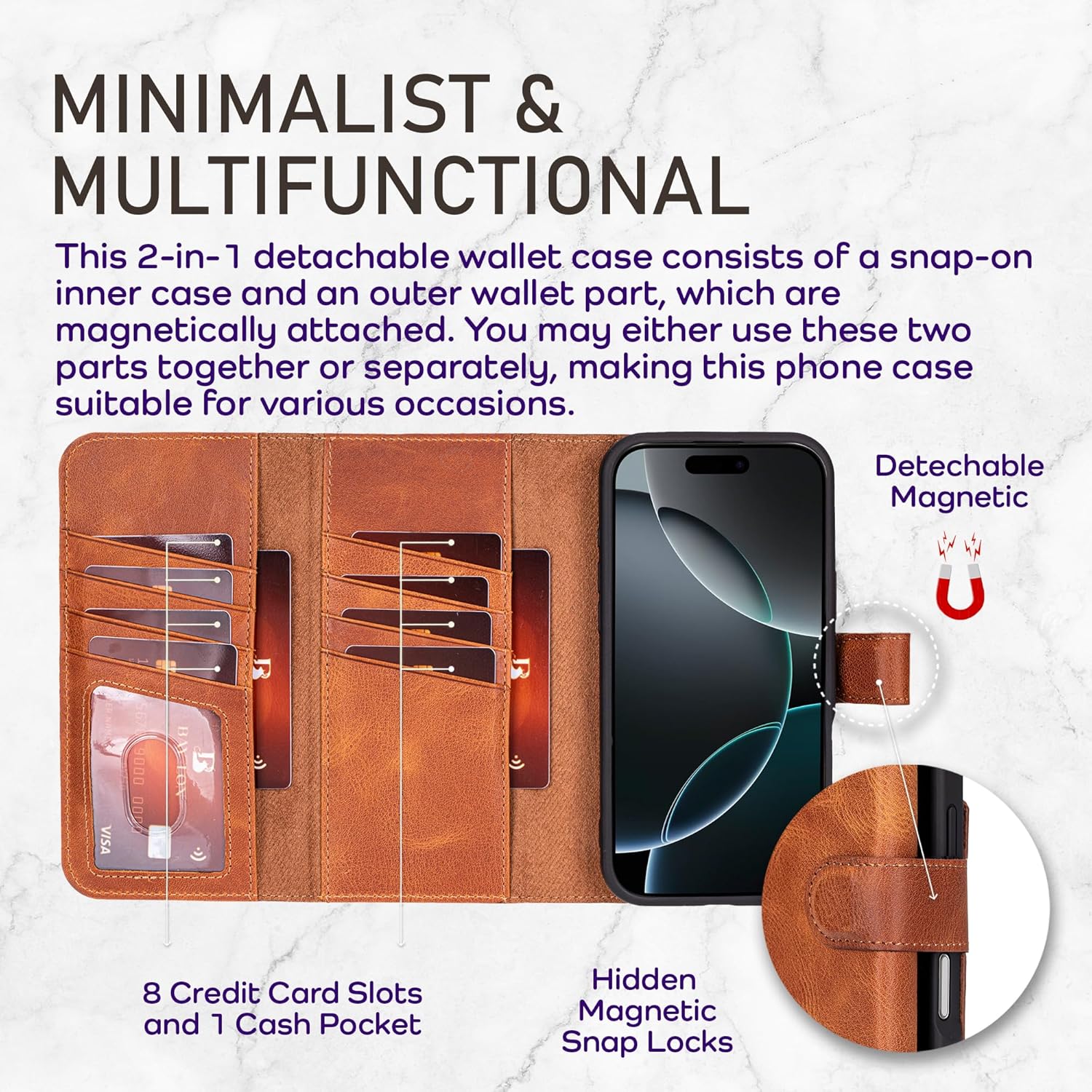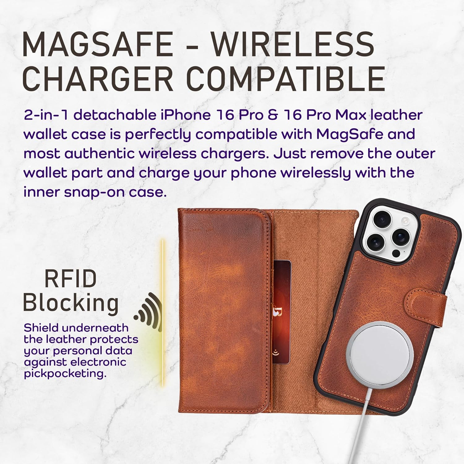 MAGSAFE COMPATIBLE & WIRELESS CHARGING: Our 2-in-1 detachable leather case is perfectly compatible with MagSafe and most authentic QI wireless chargers as well as other NFC Applications. Just remove the outer wallet case part and charge your phone wirelessly with the inner snap-on case. Avoid placing wallet leather case near wireless chargers prone to overheating, as this could result in permanent marks on your case.