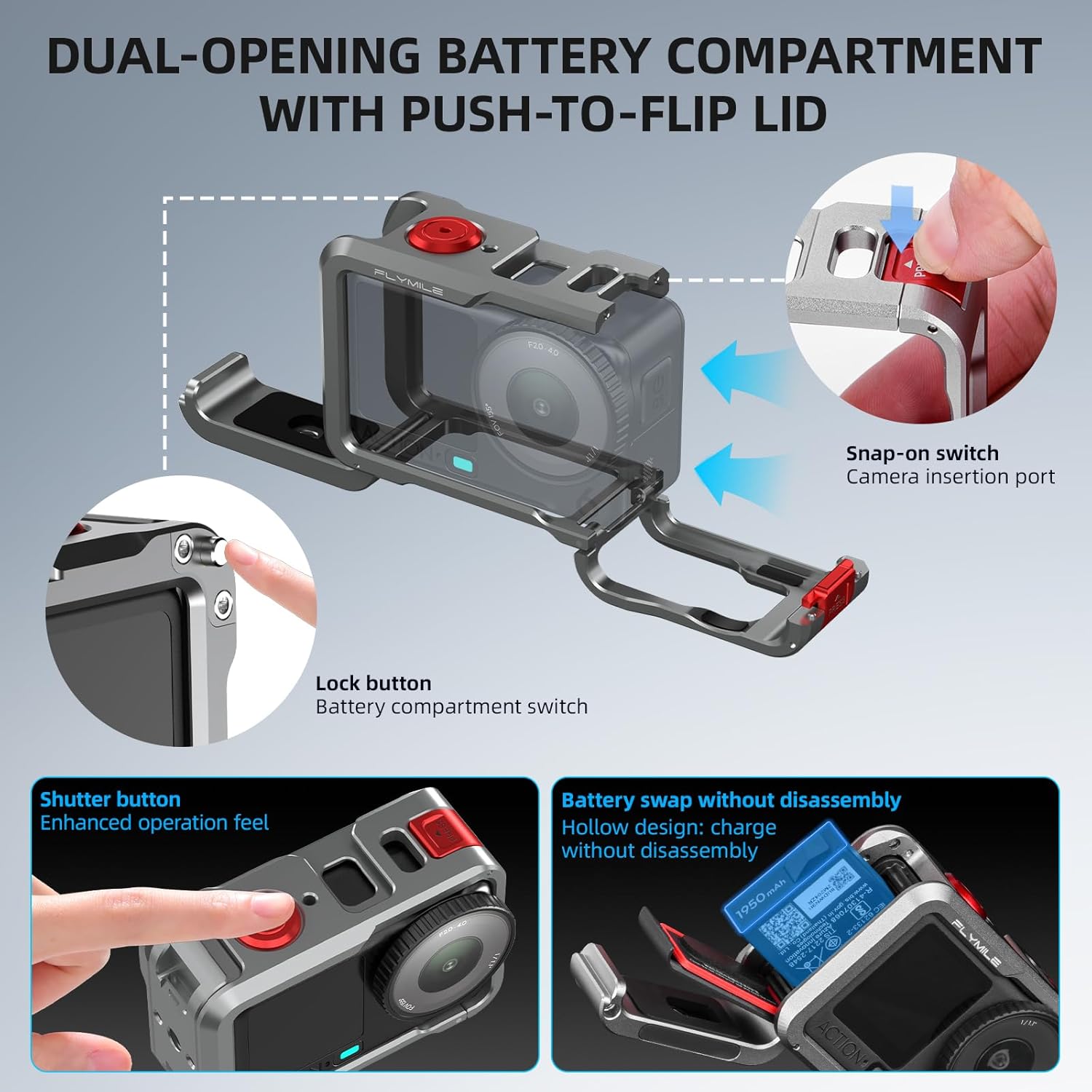 【Durable and Easy to Operate】Made of high-quality aluminum alloy with excellent impact resistance, the cage provides full protection for the camera body and corners. Its double-sided open battery compartment with press-to-open cover enables one-handed quick battery and memory card replacement; the right-side hollow design supports charging without disassembly, and the open-bottom structure is compatible with quick-release bases, eliminating the hassle of frequent assembly and disassembly.