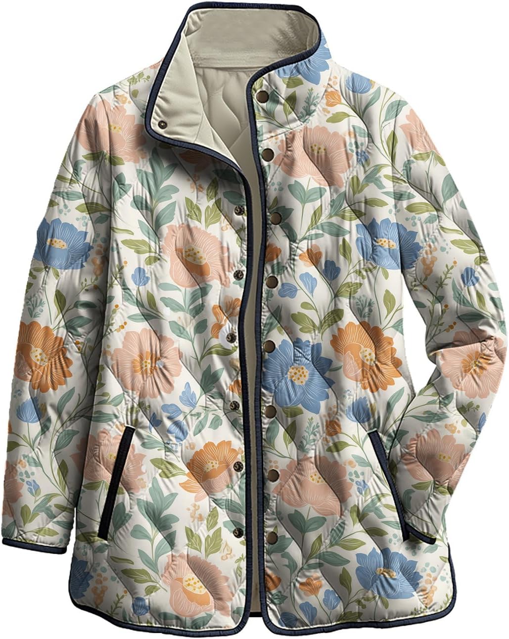 2️⃣ Elegant Design – Quilted Jackets for Women, Women’s Button Down Jacket, Fall Jackets for Women 2025, Womens Puffer Jacket, Two Hand Pockets, Long Sleeves, Loose Fit, Floral Print, Stand Collar, Snap Front, a Chic Diamond Texture.