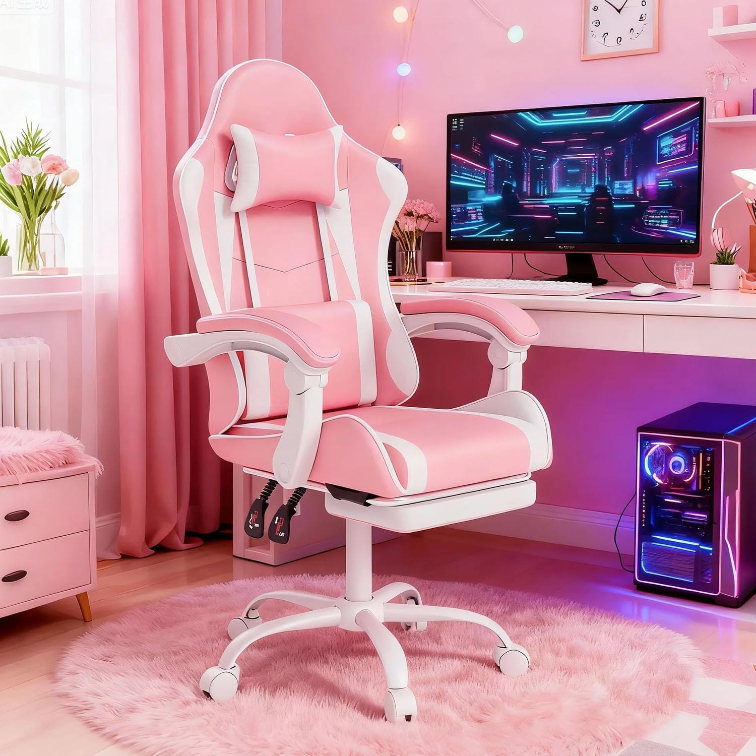 Gaming Chair with Headrest and Lumbar Support, Ergonomic High Back Office Chair, Racing Style Executive Computer Desk Chair, Leather Adjustable Swivel Task Chair for Home Office (Pink White)