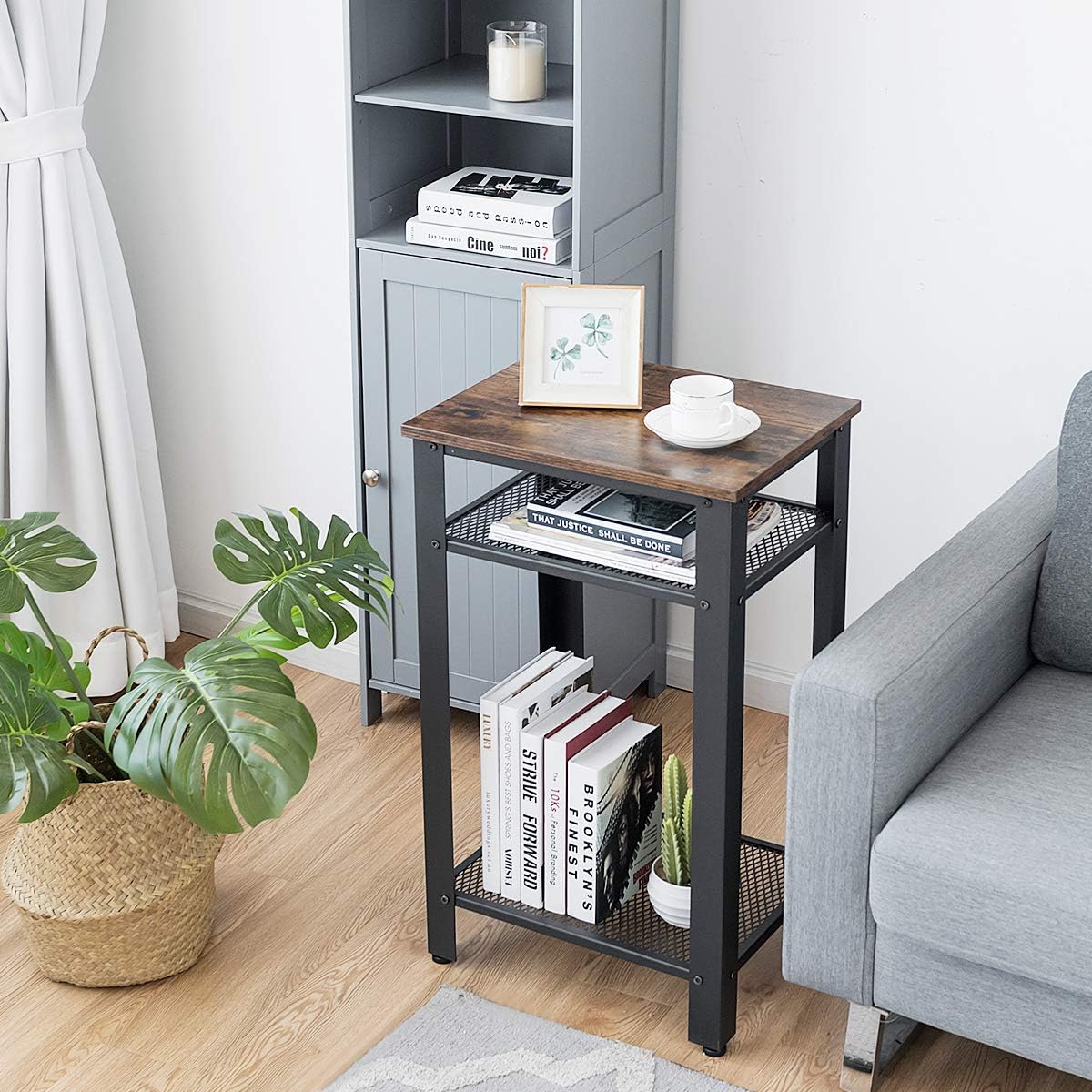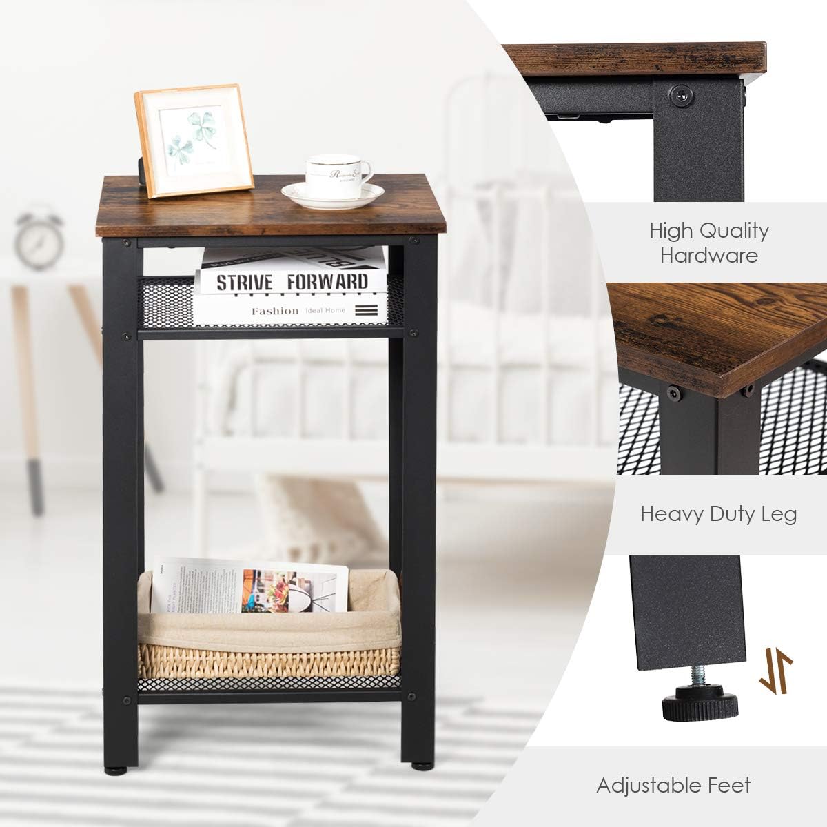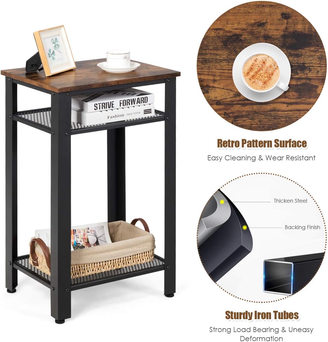 Giantex Side Table Industrial 3-Tier W/Mesh Shelves, Adjustable Feet and Metal Frame,Tall Nightstand Telephone Table for Living Room, Bedroom Accent Furniture End Table (1, Rustic Brown)