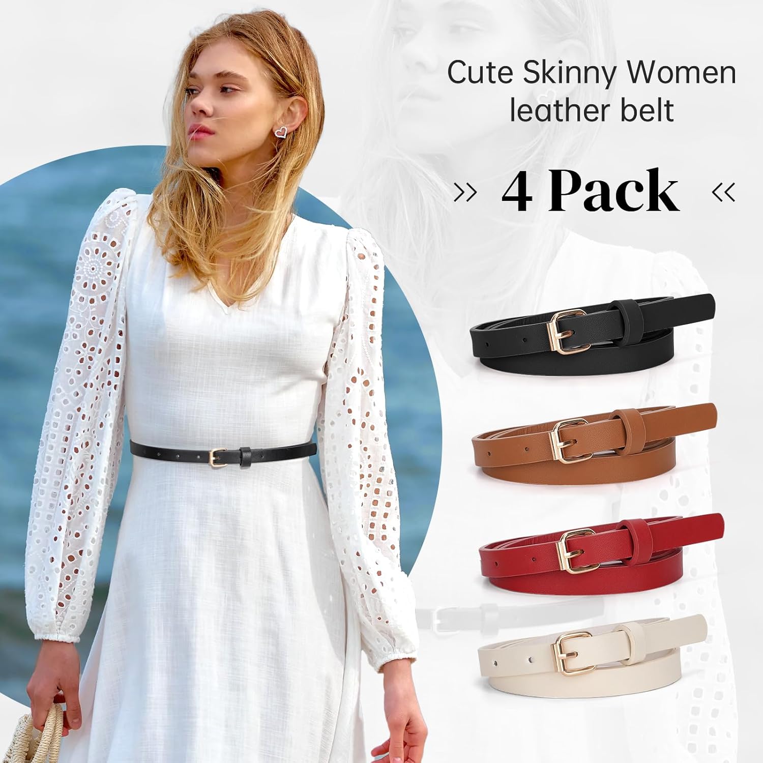 JASGOOD 4 Pack Skinny Women Leather Belt for Dresses Thin Waist Belt for Jeans Pants with Gold Buckle