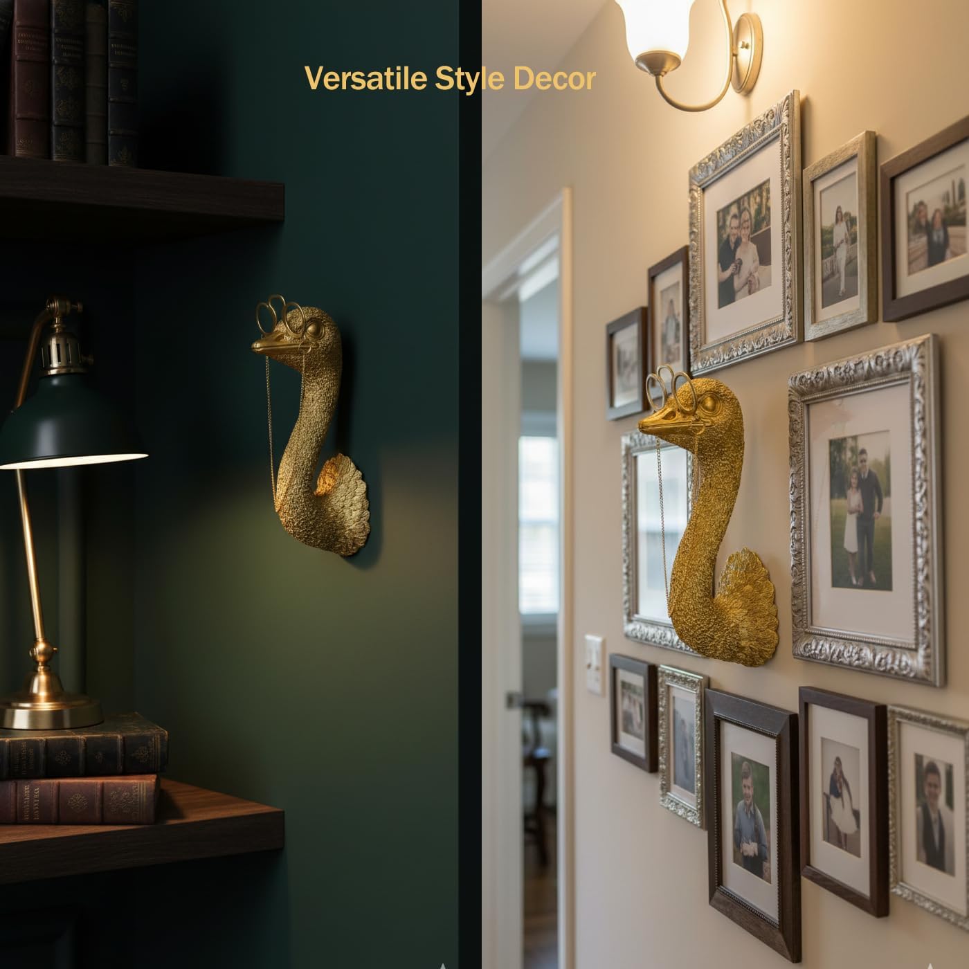 【Whimsical Golden Animal Head Ostrich Sculpture】Bring a playful yet sophisticated charm to your home, office, or studio with this quirky golden ostrich figurine. Featuring a long neck, stylish glasses, and textured metallic finish, it sparks conversations and adds character to any space.