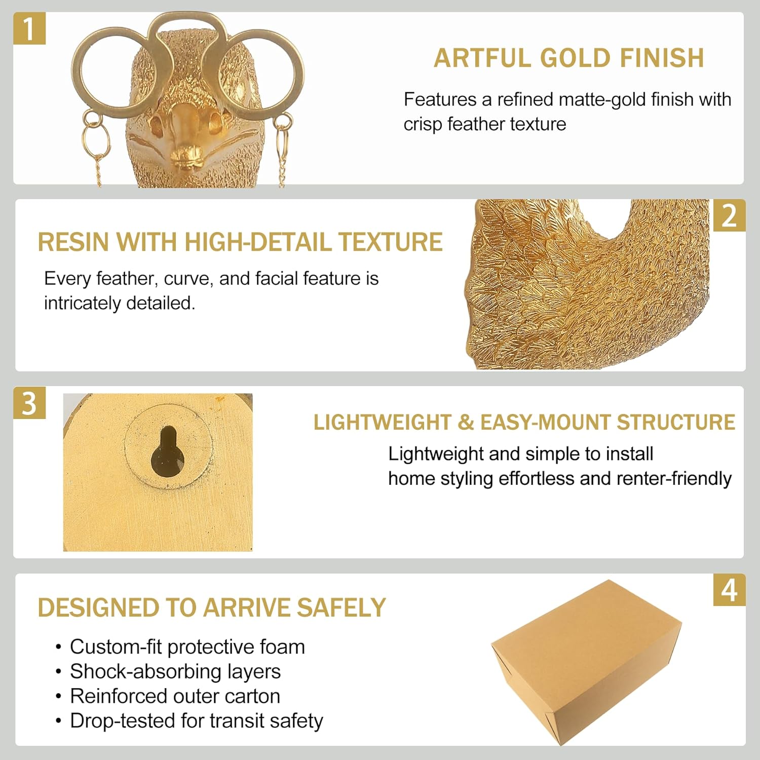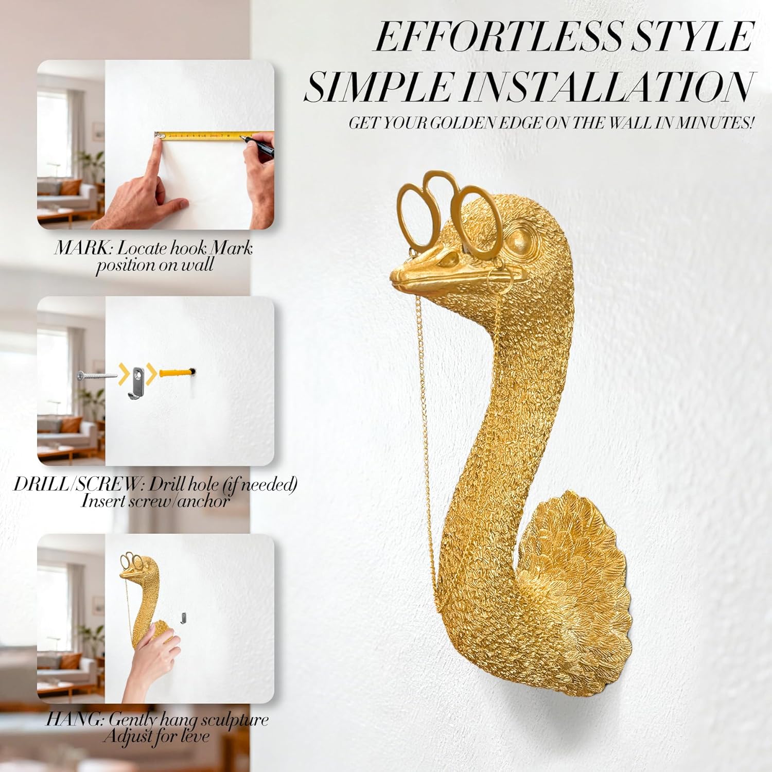 A wall-mounted golden ostrich decorative sculpture made for indoor wall display.Crafted from high-density resin for solid feel, crisp detail, and a durable antique gold finish that maintains its refined look over time.