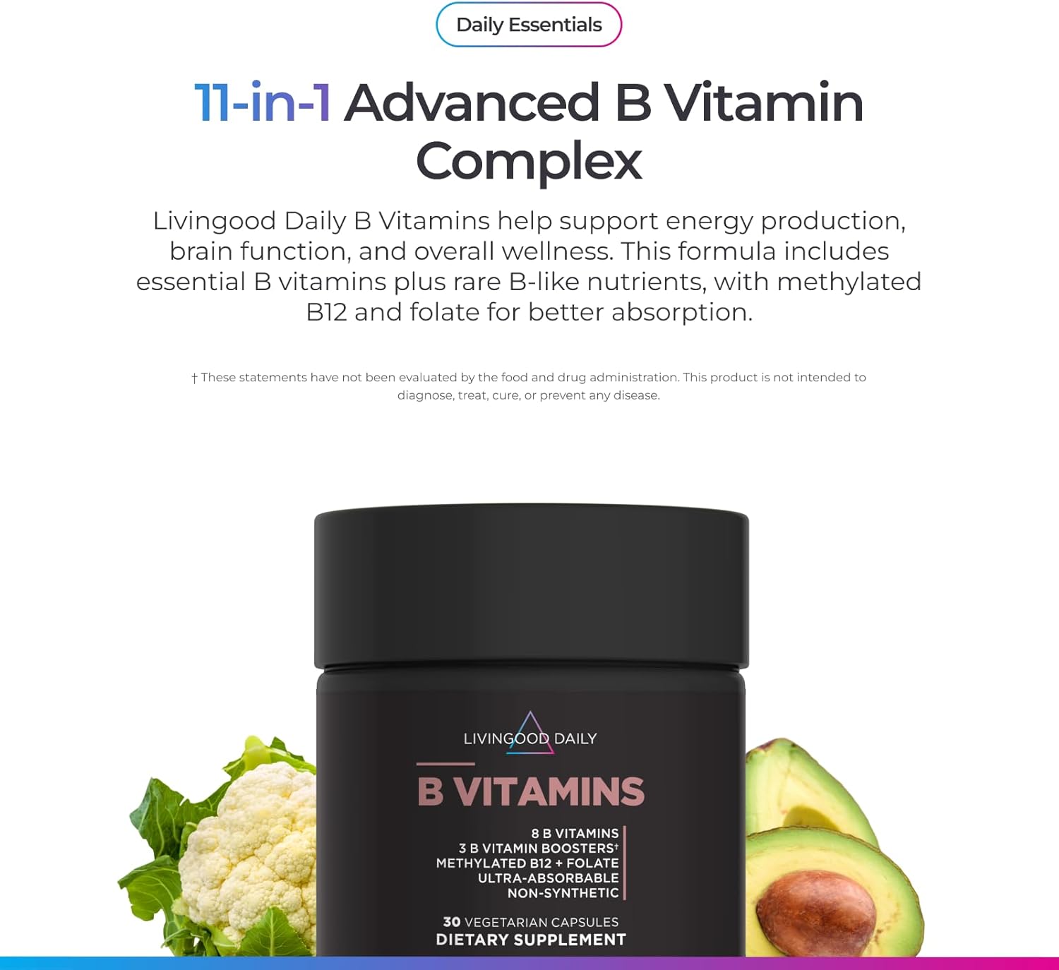 Livingood Daily Vitamin B Complex Capsules for Men and Women, Methylated B12 & Folate, 11 Active Forms Including B1 B2 B3 B5 B6 & Biotin, Gluten Free, Vegan B Vitamins for Hair Skin Nails, 30 Capsules