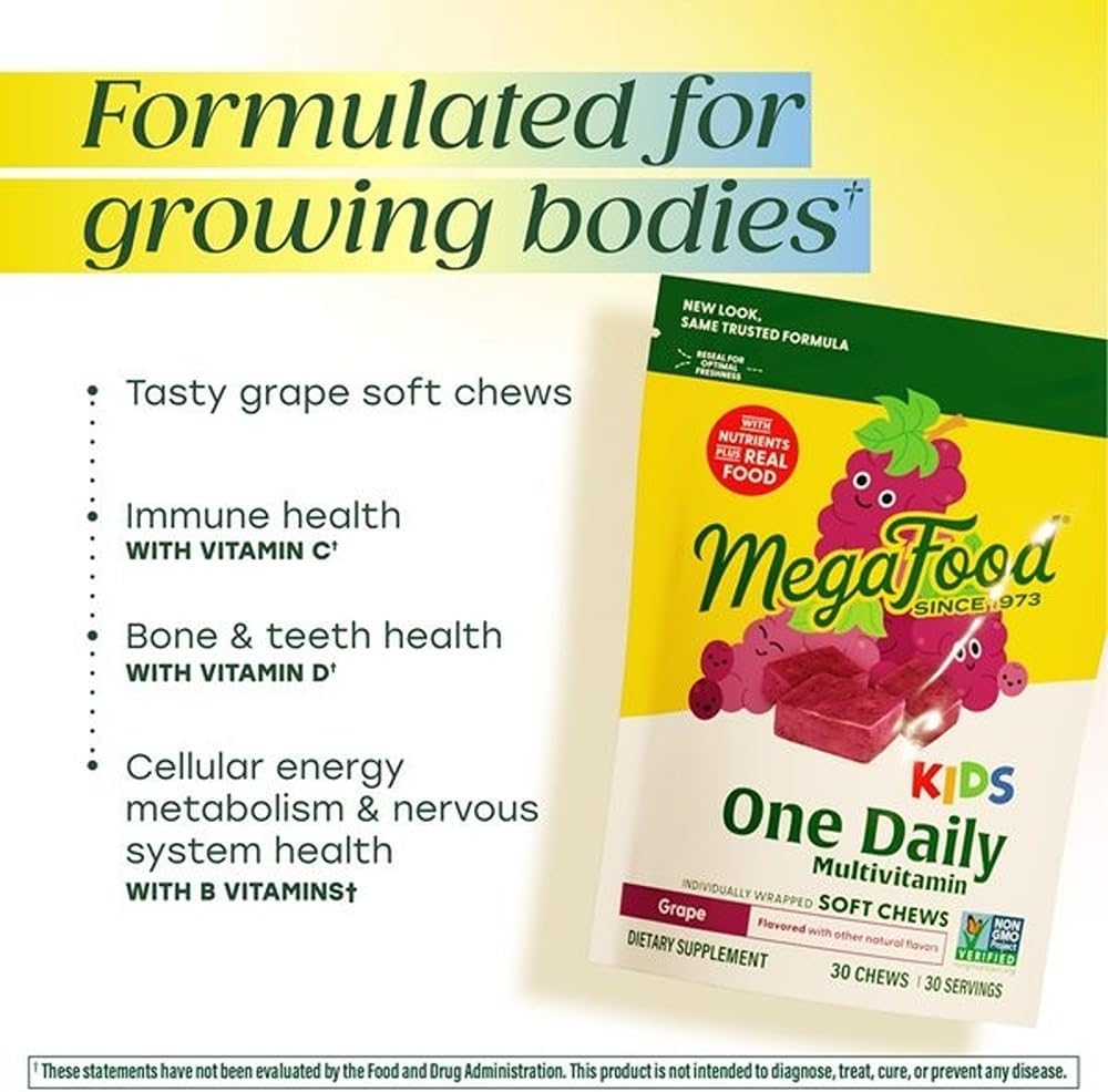 MegaFood One Daily Kids Vitamins Multivitamin Soft Chews – Vitamin B, C, D & E – Age 4+, Vegetarian, Made Without 9 Food Allergens – Grape Flavor – 30 Chews (2 Pack)