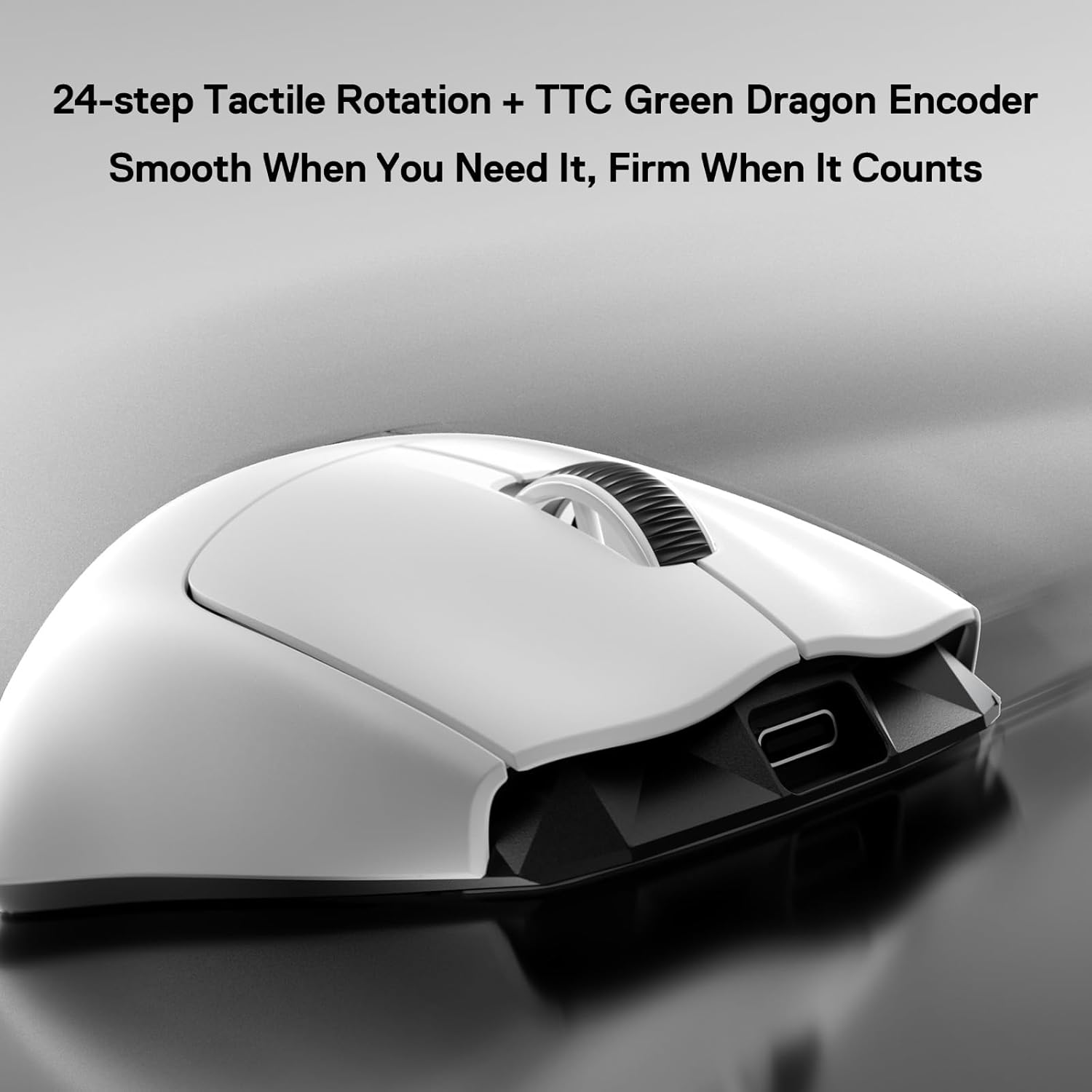 PAW3950 Flagship Sensor — Horus delivers pixel‑level tracking accuracy across a wide 400–30,000 DPI range. With five customizable DPI presets. Switch effortlessly with the bottom DPI button to match your scenario, from the rock‑steady 400 DPI precision gamers rely on, to ultra‑responsive speeds for daily tasks.