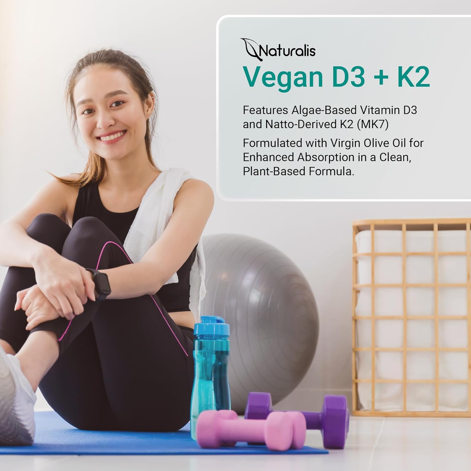 Naturalis Vegan Vitamin D3+K2 from Algae | 5000 IU D3 with 120mcg MK7 | Vegan Society Certified,Sustainably Sourced,Better Than Animal Derived | Better Support for Bone & Immune Health* | 60 Softgels