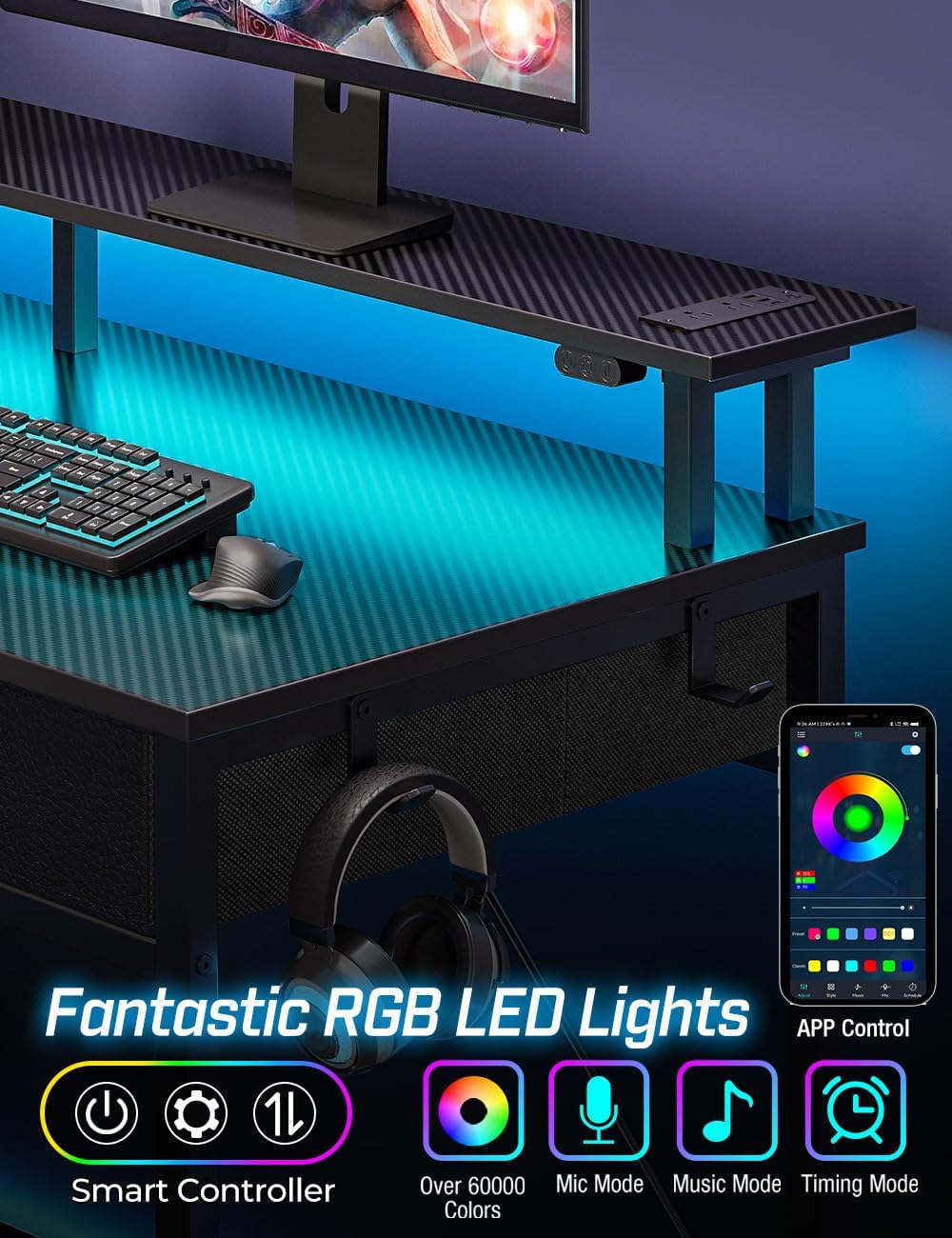 Gaming Desk with Multifunctional LED: Enjoy the gaming desk with vibrant multi-color RGB LED light strips. 60,000 colors controlled by the Phone App or controller enables you customize brightness, color, mode, and timer settings. The LED lights also sync with music, creating a romantic and energetic atmosphere for gaming