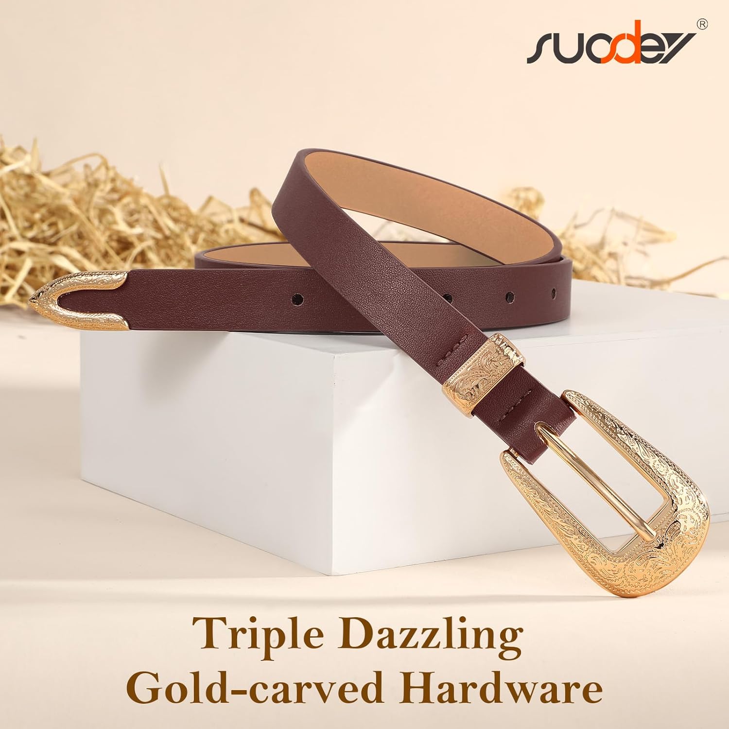 SUOSDEY Western Skinny Leather Belt for Women Cowgirl Cowboy Carving Buckle Waist Belt for Jeans Dresses,0.8″ Width