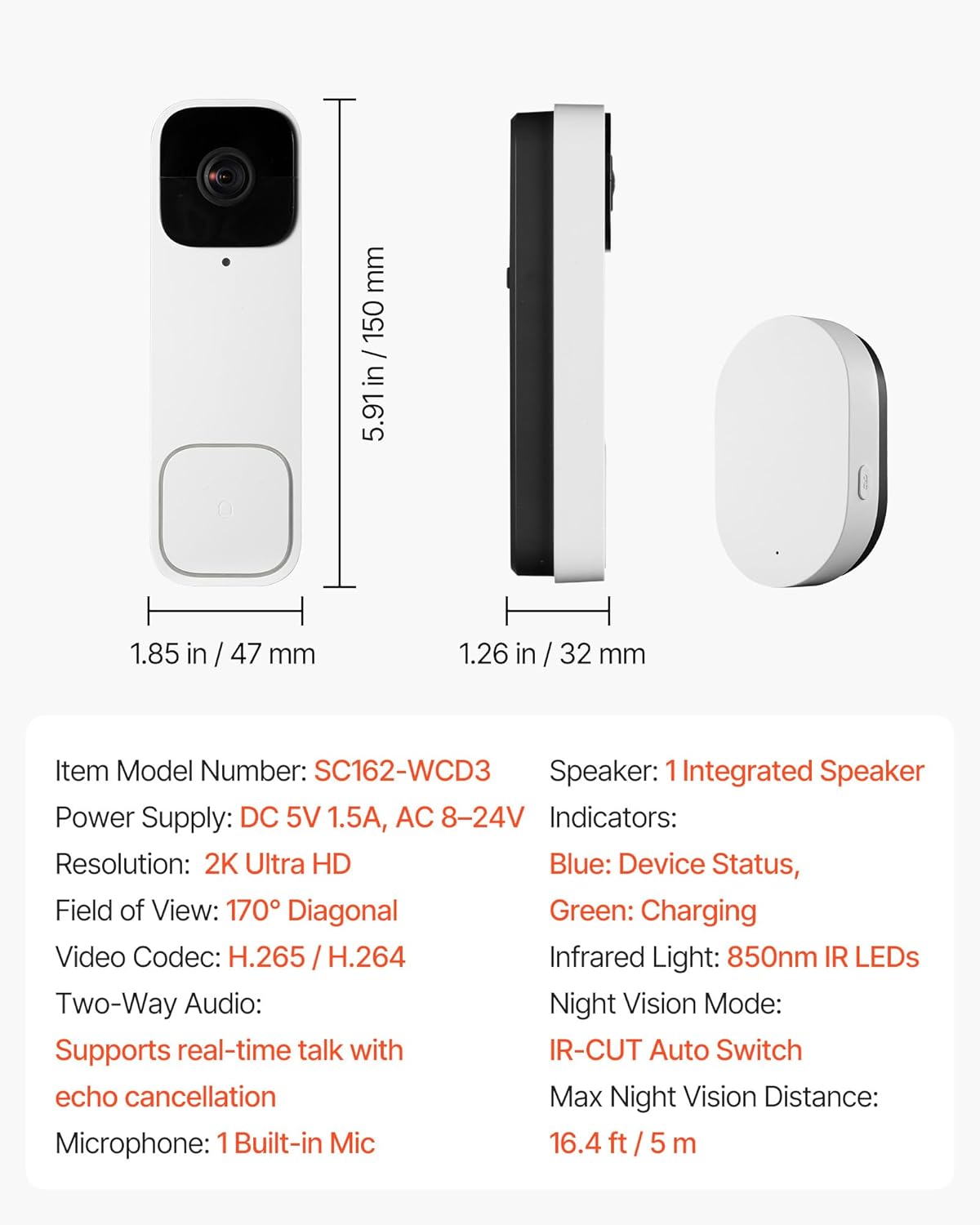 VEVOR Video Doorbell, 2K Wireless Camera Ring Doorbell Works with 170° Ultra-Wide View, 2-Way Audio, Motion Detection & Night Vision, Supports Alexei & Google, Cloud Storage, Battery/Wired Powered