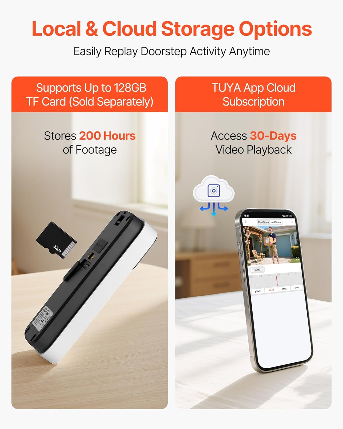 Large Storage & Long Battery Life: This doorbell camera supports up to 128GB TF card (sold separately) for 200 h of loop recording or TUYA cloud storage. Its 5300mAh battery lasts up to 180 days (5 times a day), while wired mode enables 24/7 recording
