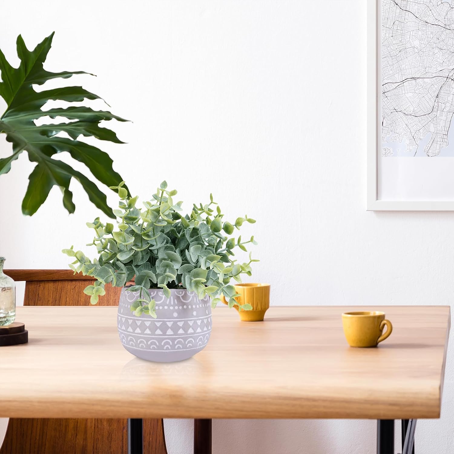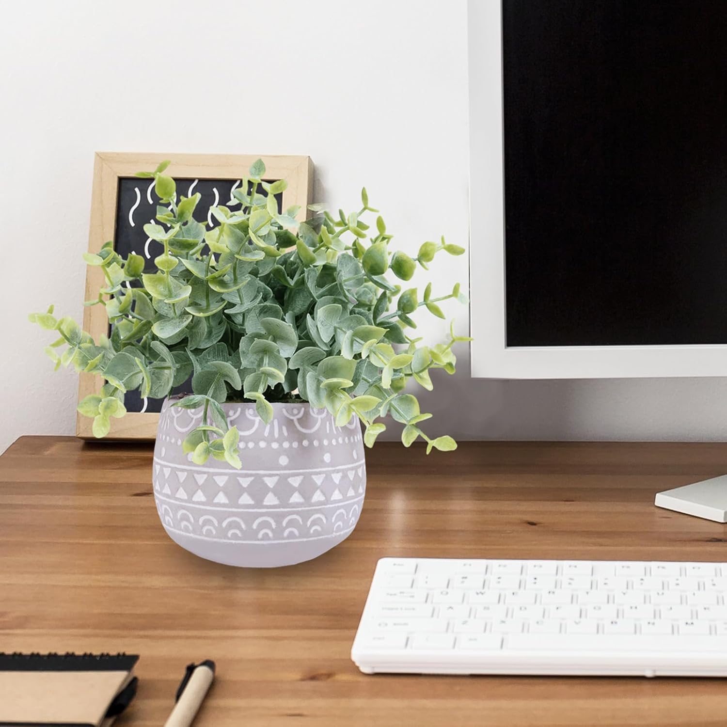 Color: Artificial eucalyptus plants are two-tone green with a light powdery finish. They sit in gray round pots with white geometric designs which for a chic boho look. Featuring elaborate carved geometric detailing and matte gray finish, these sophisticated concrete planters highlight the artificial green plants set inside and can complement to any decorating style. These faux eucalyptus in pots will create a warm and cozy atmosphere to any setting.