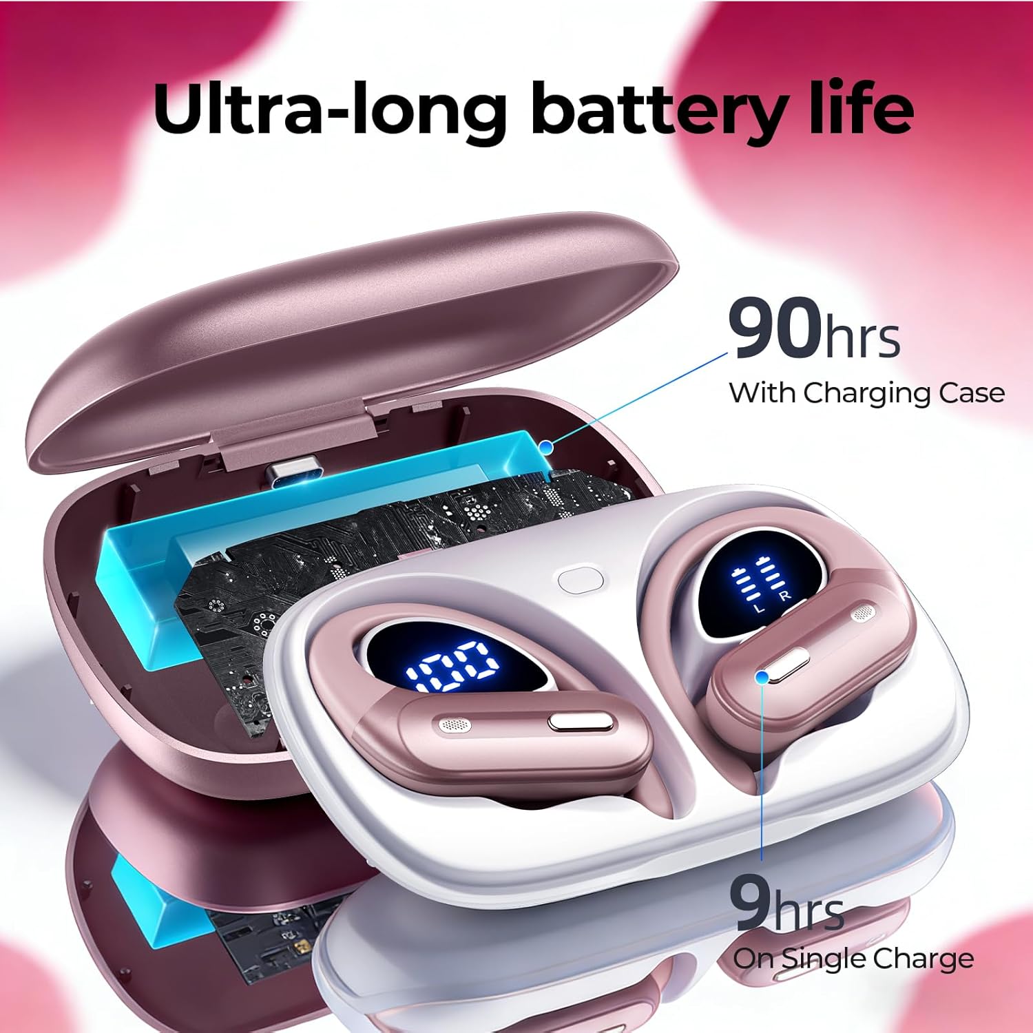 【90 Hours Playtime & Dual Charging Modes】Enjoy up to 90 hours of total playtime with the charging case. Supports USB-C and wireless charging, with a dual LED display to track battery levels at a glance.