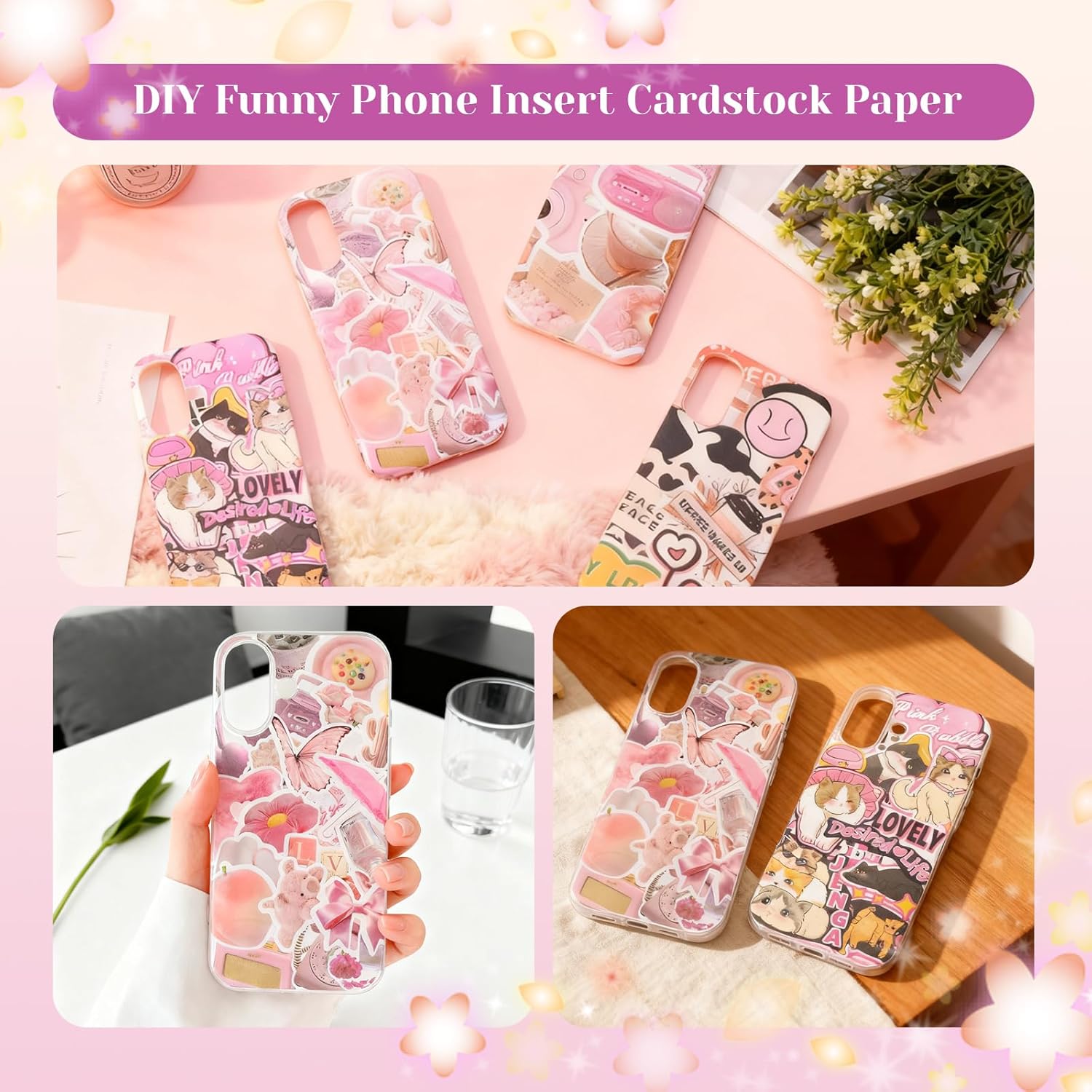 DIY Stickers Collage kit: Pink stickers for girls as journal scrapbooking gift! The precise size of each insert card is 2.8 inches × 5.8 inches, suitable for iPhone 16. Placing the stickers on the front cardstock and cutting off the excess. Put it in the phone case (note the opposite side)